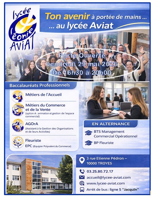 « Vous souhaitez découvrir le lycée Léonie Aviat. Soyez les bienvenus. À la limite du « Bouchon de Champagne », coeur de la ville de Troyes, cet établissement catholique d’enseignement propose, dans un cadre paisible et verdoyant, des formations de CAP et de BAC Pro.